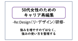 ― Re:Design(リ・デザイン)研修 ― ナラティブ(物語)をベースにした人生とキャリアの再編集研修 50代女性の多くが、まじめで、経験もあり、力もあるのに、なぜか「やりづらさ」や「報われなさ」を感じています。 R […]