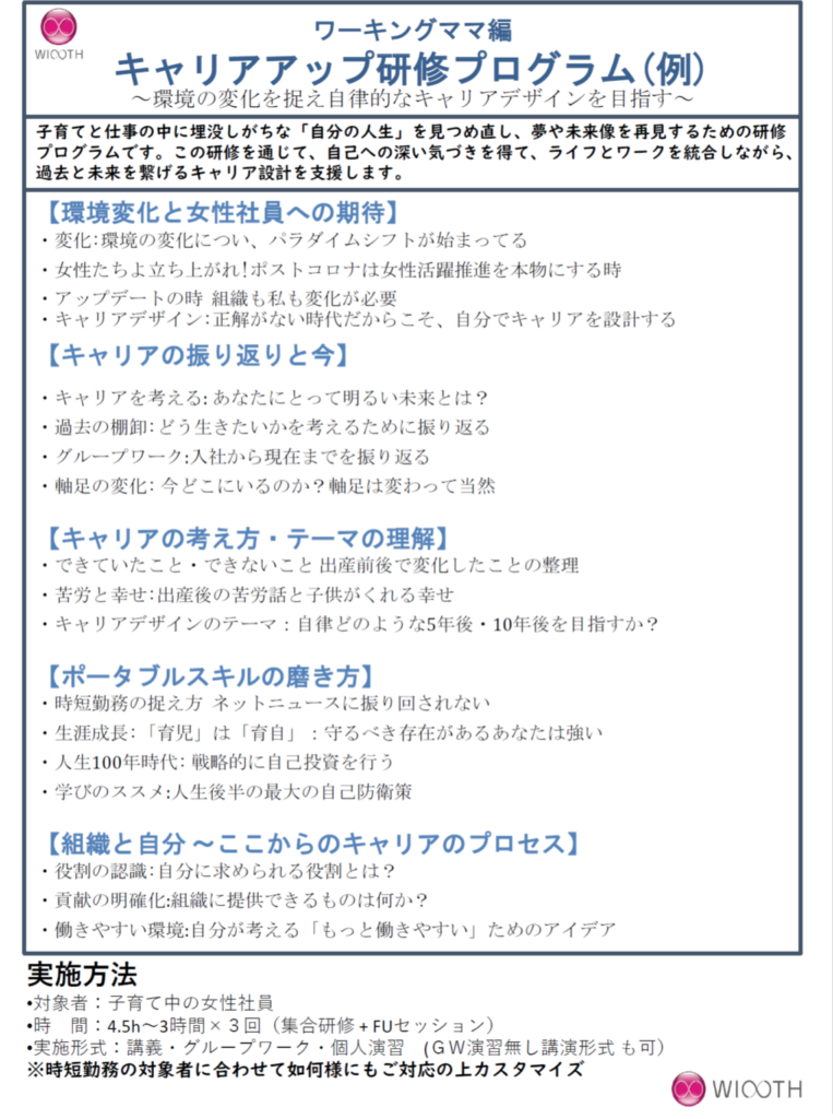 講師自身の子育て経験に基づき、働く母親たちへの深い共感と強い思いを込めて設計された、現状をポジティブに変えるための研修プログラムです。