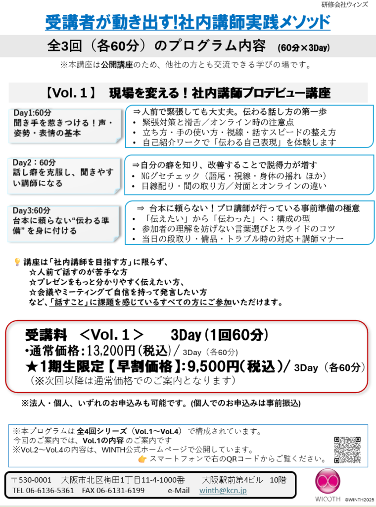 winth@kcn.jp 宛に「社内講師講座申込希望」とご記入のうえお送りください。